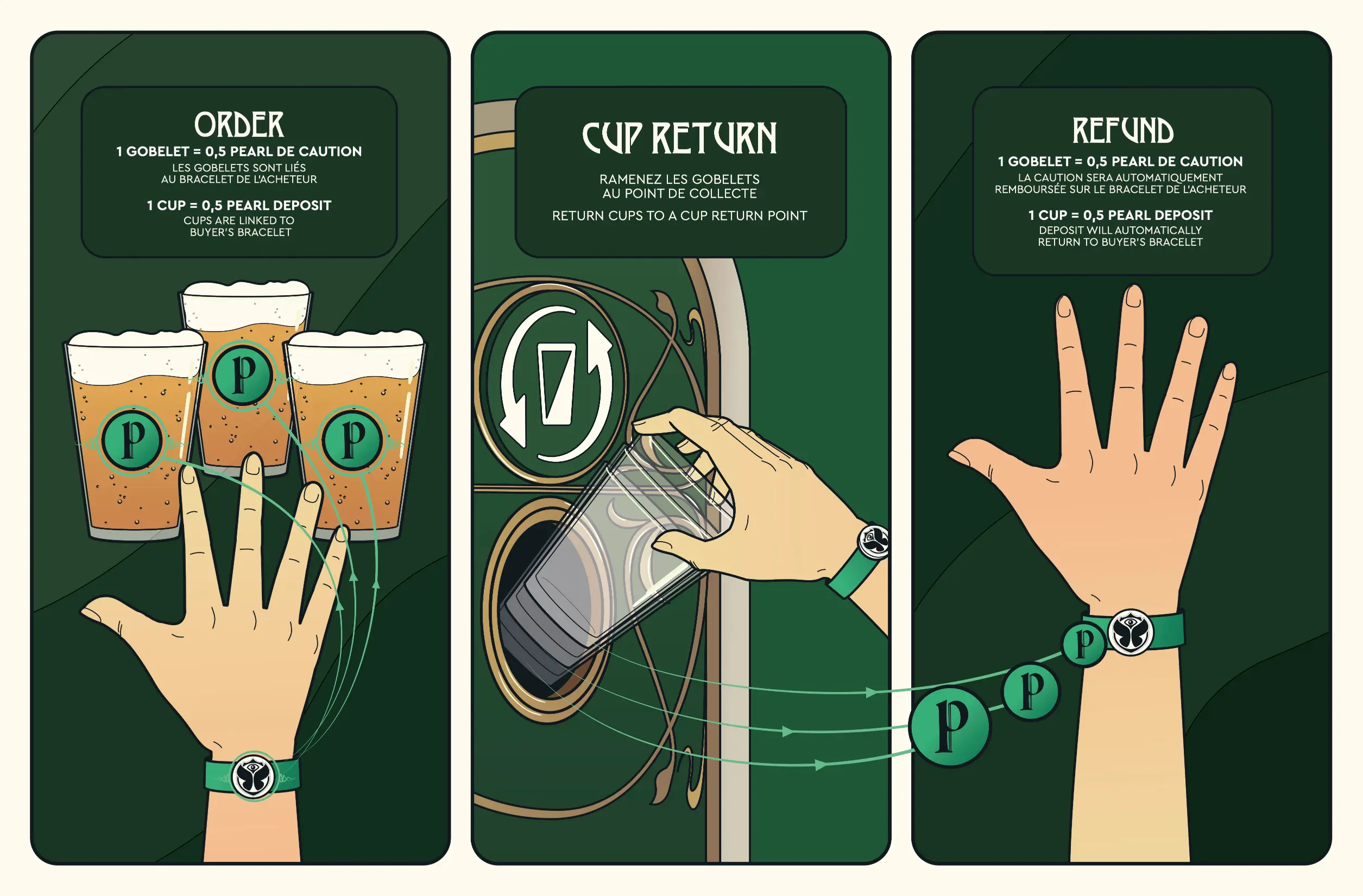 1. Order your drinks. Order at one of the many bars at Tomorrowland Winter. One cup equals a half Pearl deposit, and the RFID chip of the smart cup is linked to the Bracelet or cashless card upon payment.